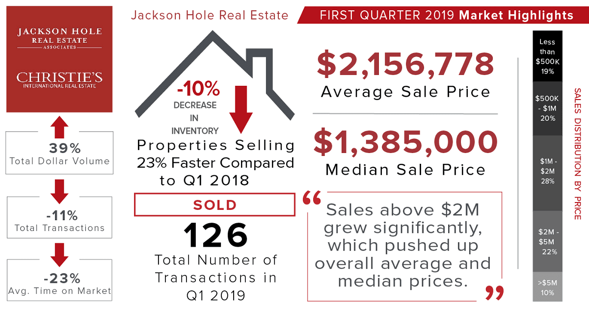 The Jackson Hole real estate market is off to a strong start through the first quarter of 2019, buoyed by continued demand for high-dollar properties. A jump in luxury property sales significantly pushed up the overall average and median sales prices, including one notable property listed above $17 million, even though the number of transactions fell compared to the first quarter of 2018.